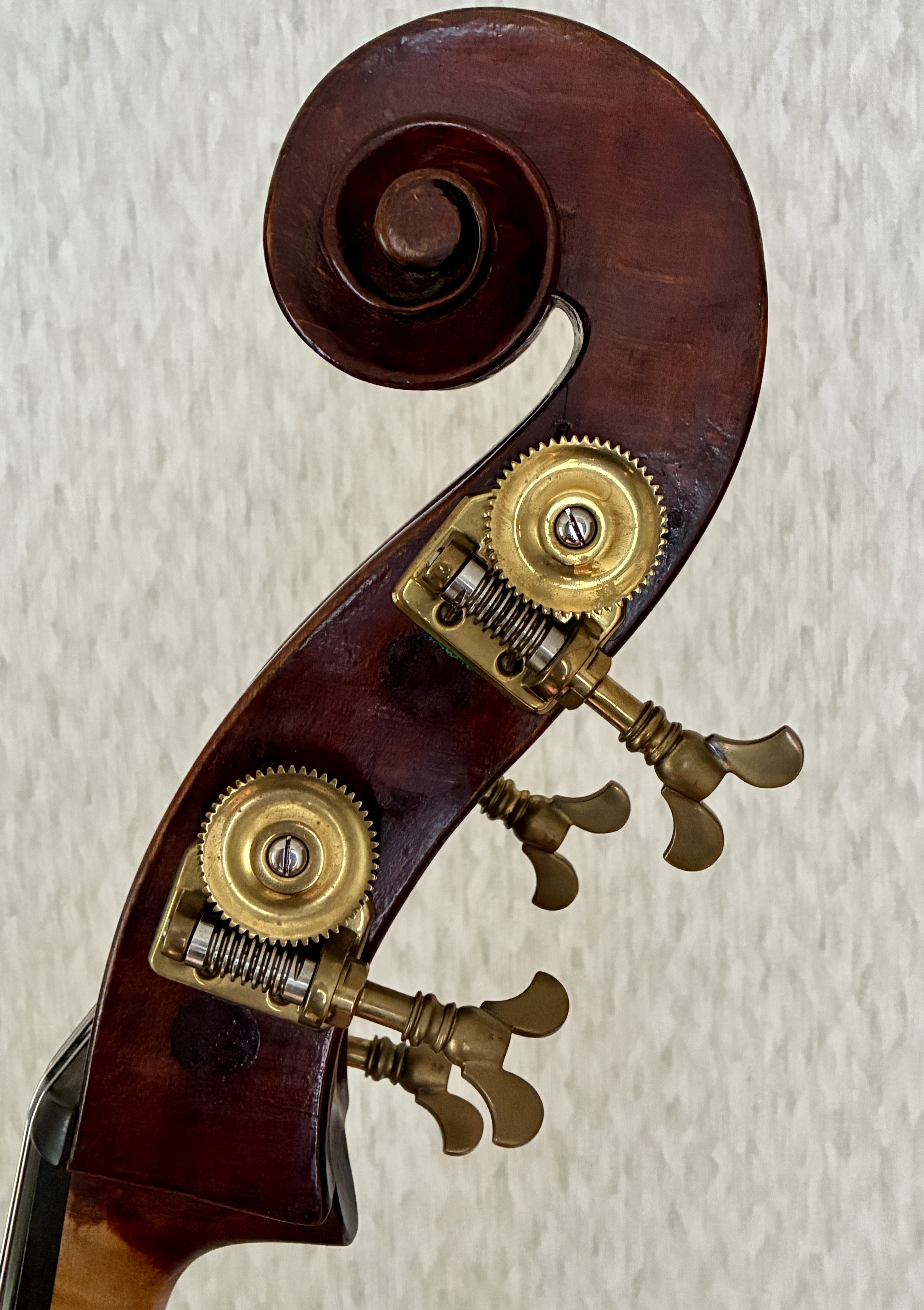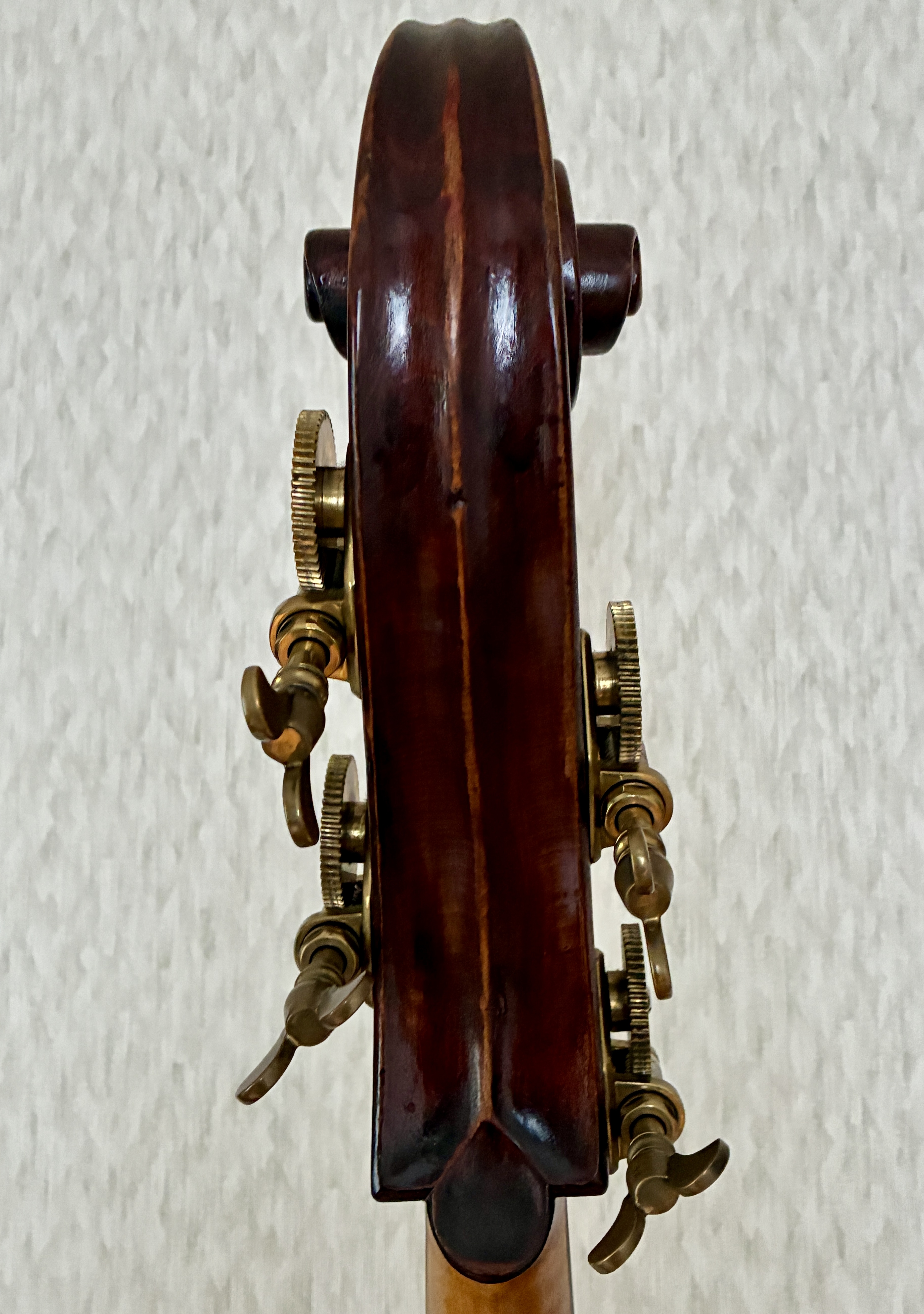 R.Calaceはプロのマンドリニスト、作曲家としても有名で、のちに様々な撥弦楽器やヴァイオリン系列の楽器を製作しました。様々な撥弦楽器やヴァイオリン・ファミリーの楽器も製作し、大型のナポリ・マンドリンの設計を完成させたことでも知られています。随所にナポリらしさを残すやや小ぶりの作品で、音もそれに準ずる素晴らしい楽器です。弦長103cm